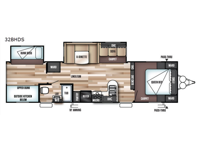 Inside the 32BHDS Wildwood travel trailer by Forest River you will find double slides and a rear bunk house which your kids will love!
